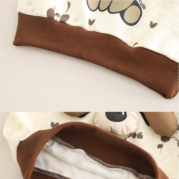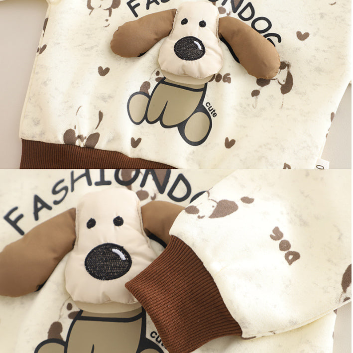 This fun puppy design sweatshirt with 3D ear details pairs with soft jogger pants for a playful look. A warm and comfy choice for fall and winter days.