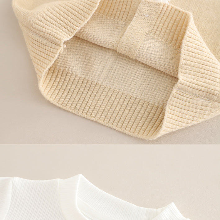 A playful kidsβ outfit featuring a cozy knit vest with lace trim, a soft long-sleeve inner top, and polka dot elastic-waist pants. Designed for comfort and everyday style, this set is both cute and practical. Available in beige or brown vest options.