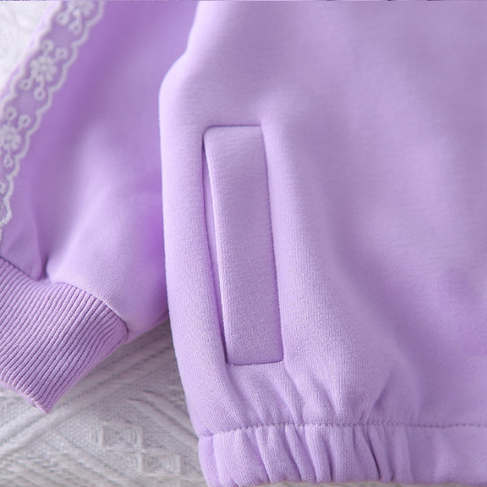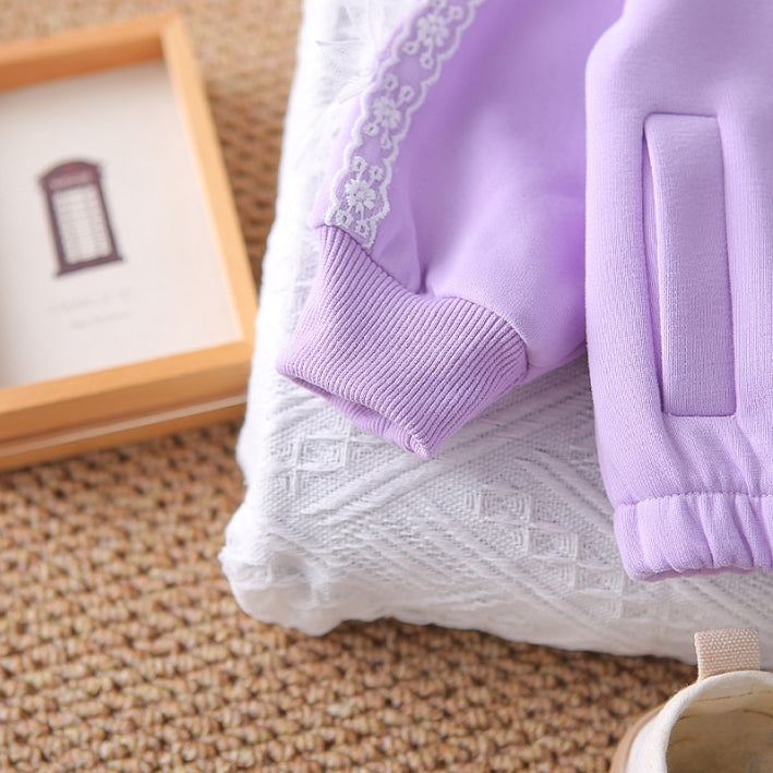 A charming 2-piece set featuring a lace-detailed jacket with bow accents and matching pants. Available in pink or purple, this outfit adds a sweet and stylish touch to your child’s everyday look.