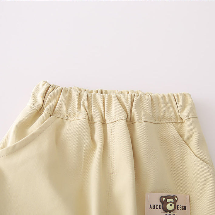 A playful 3-piece set including a bear-printed shirt, a cute teddy bear t-shirt, and matching beige pants with side detail. Perfect for everyday wear with a touch of fun.