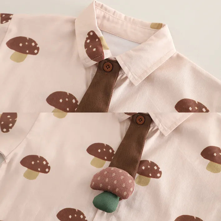 Bring a playful twist to everyday wear with this 3-piece set. Featuring a shirt with mushroom print, a knit vest with matching tie, and comfy pants, this outfit is both stylish and practical. Available in brown or green.