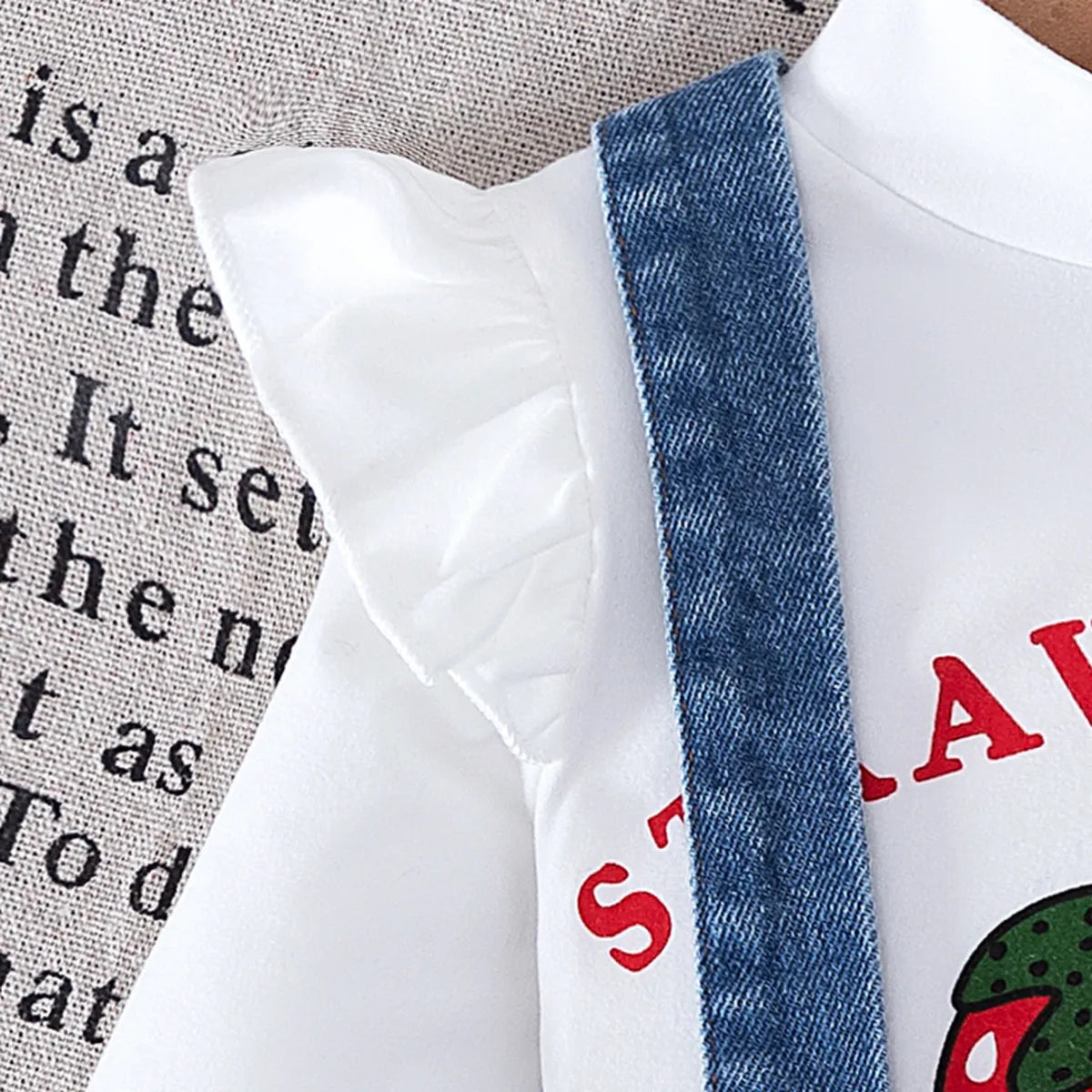 Sweet, playful, and irresistibly cute 🍓 This 3-piece set includes a ruffle-sleeve strawberry print top, a denim suspender dress adorned with embroidered berries, and a matching strawberry-shaped shoulder bag. A complete mini look for tiny trendsetters.