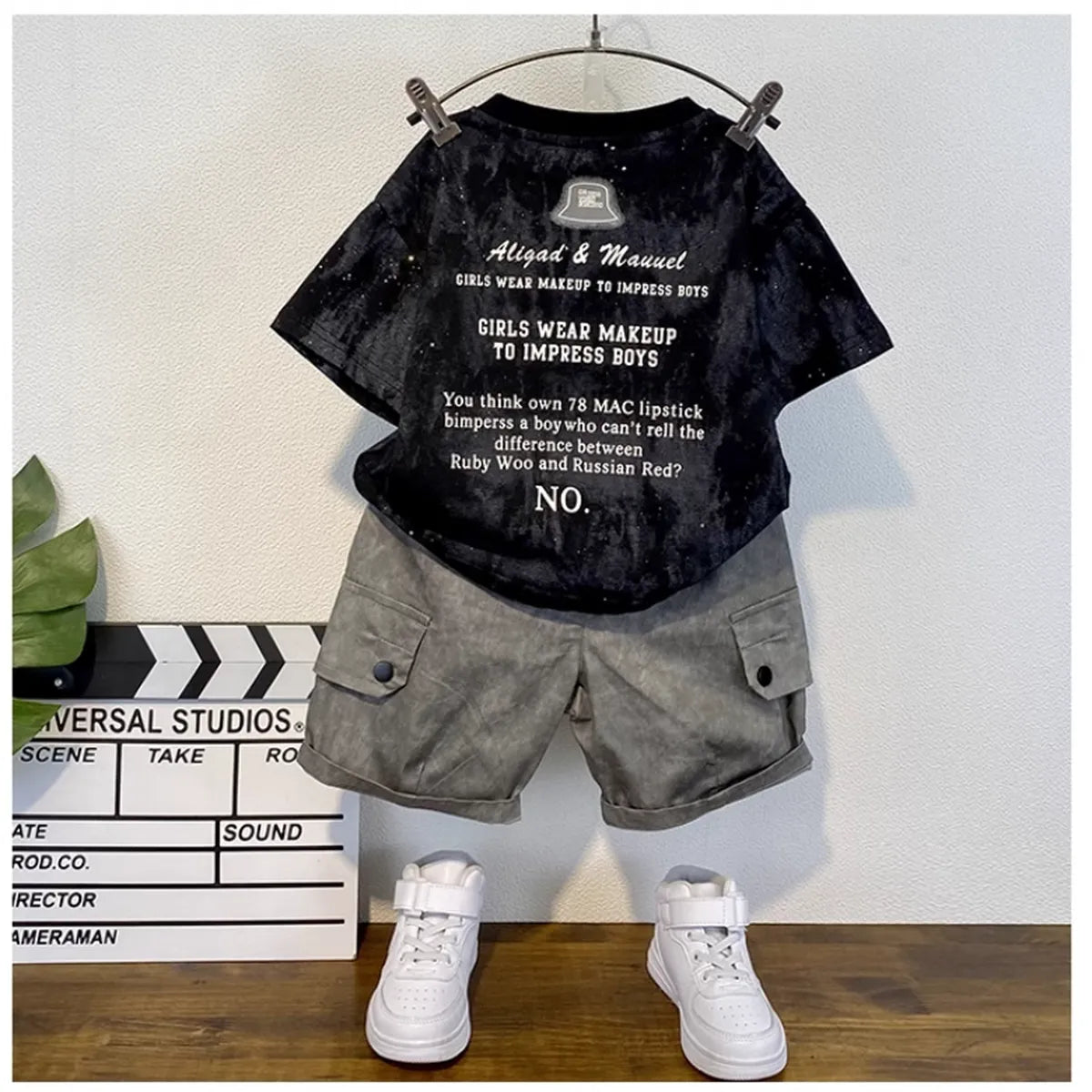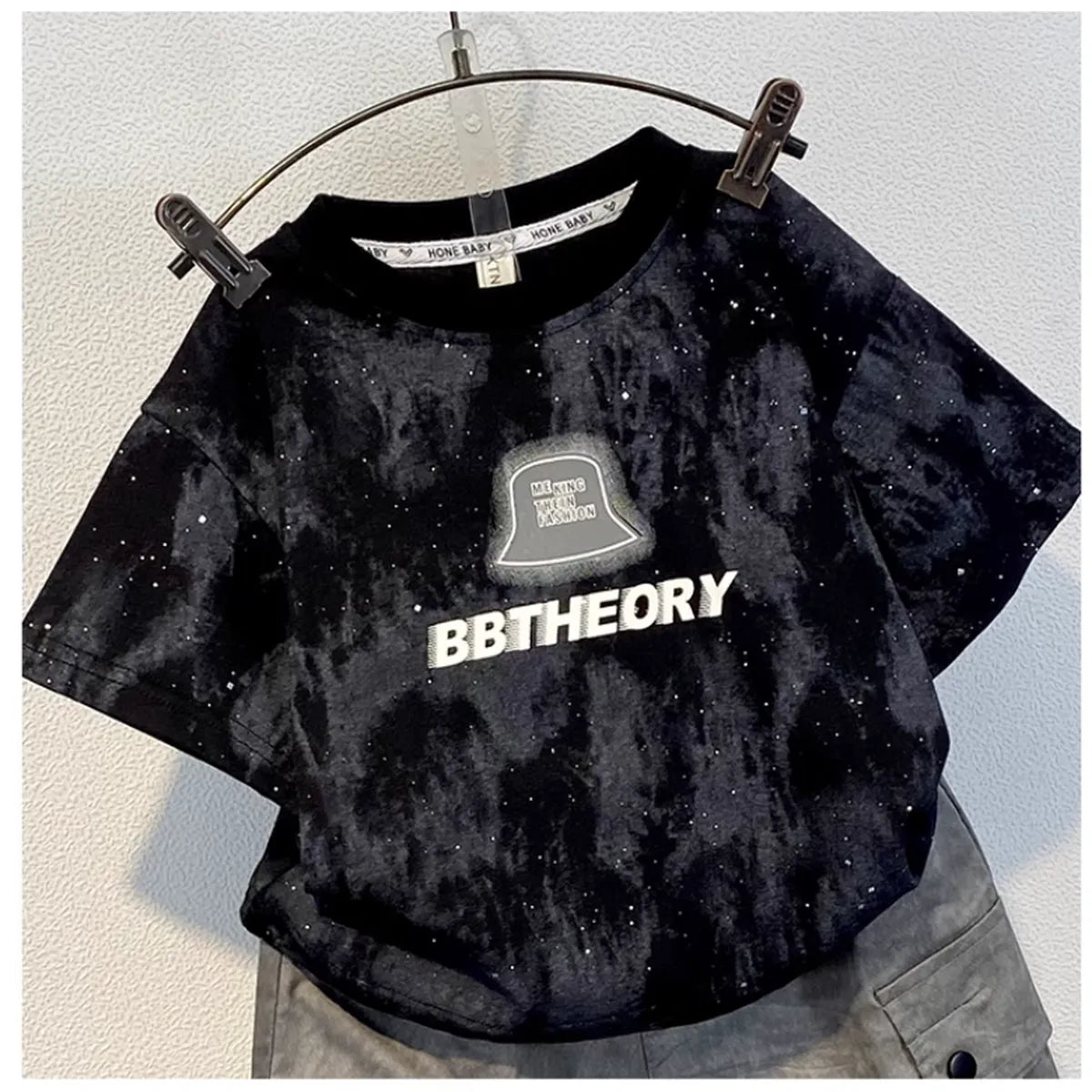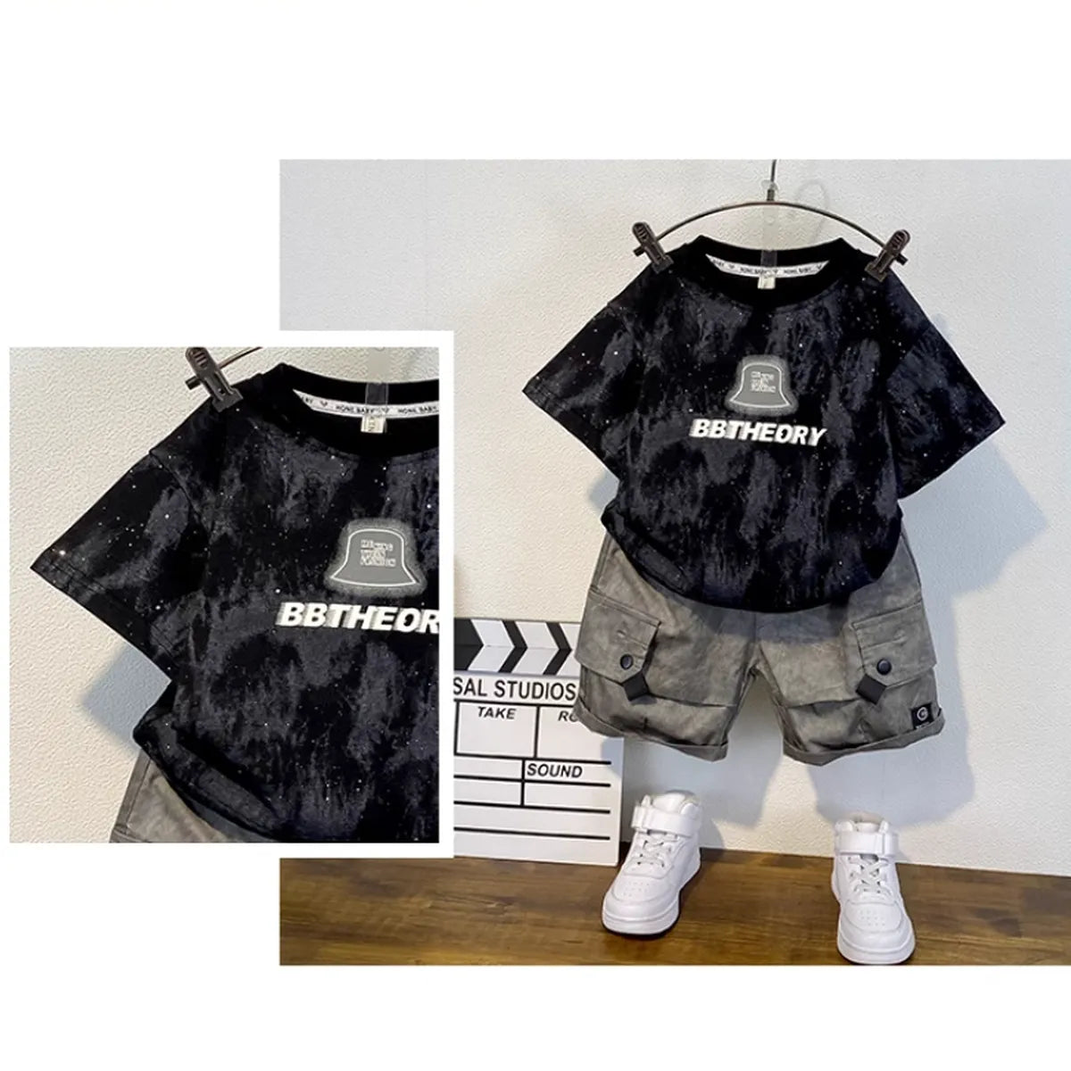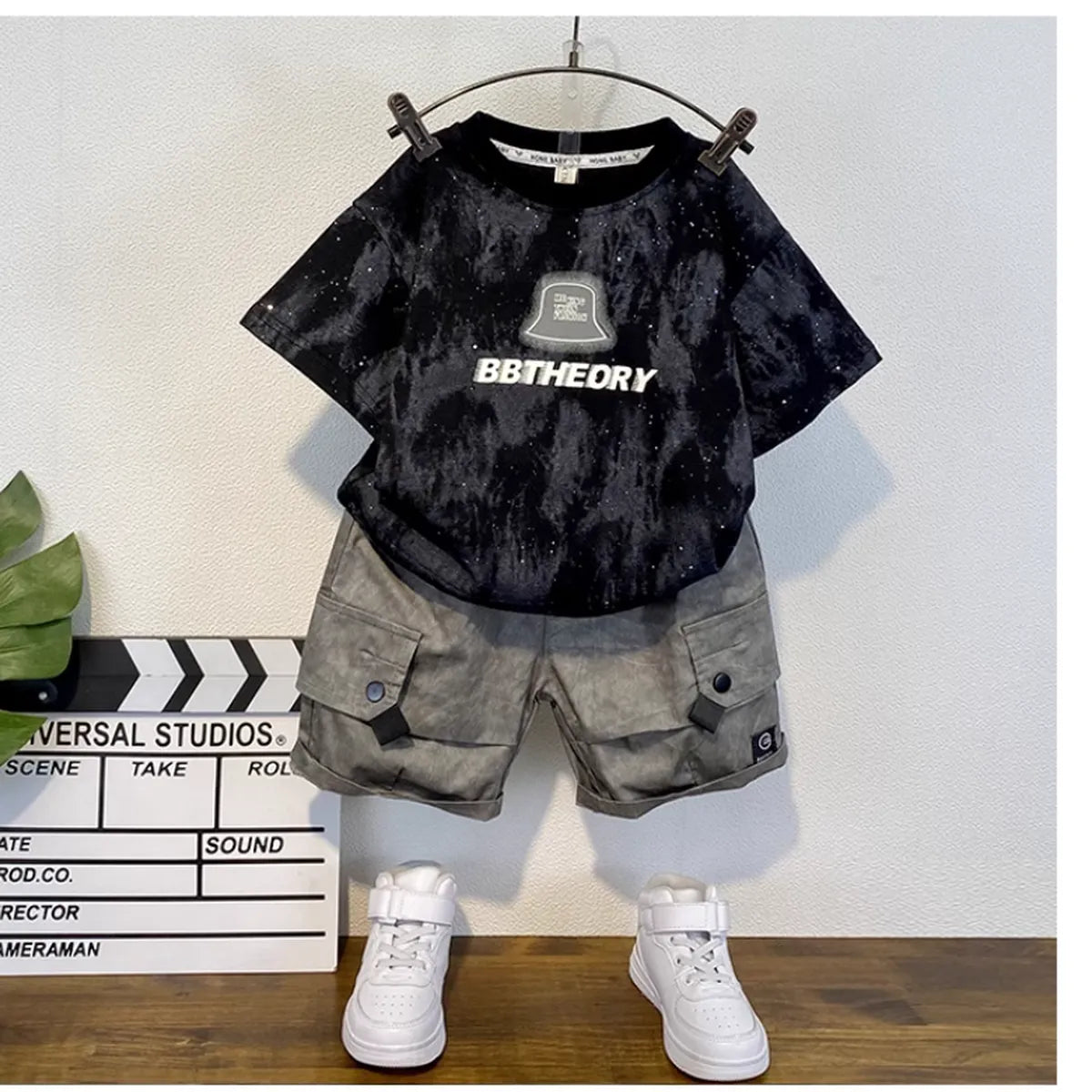 Designed for cool kids with attitude, this urban-style outfit includes a space-dyed black tee with β€œBBTHEORY” graphic and matching washed gray cargo shorts. With utility pockets and a laid-back vibe, it's made for street-ready style and daily comfort.