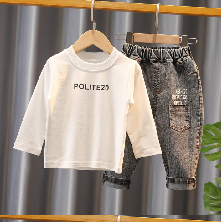 A casual 3-piece set combining a soft white t-shirt, a plaid button-up shirt, and washed jeans. Gives little boys a relaxed but neat style that works both for play and outings.