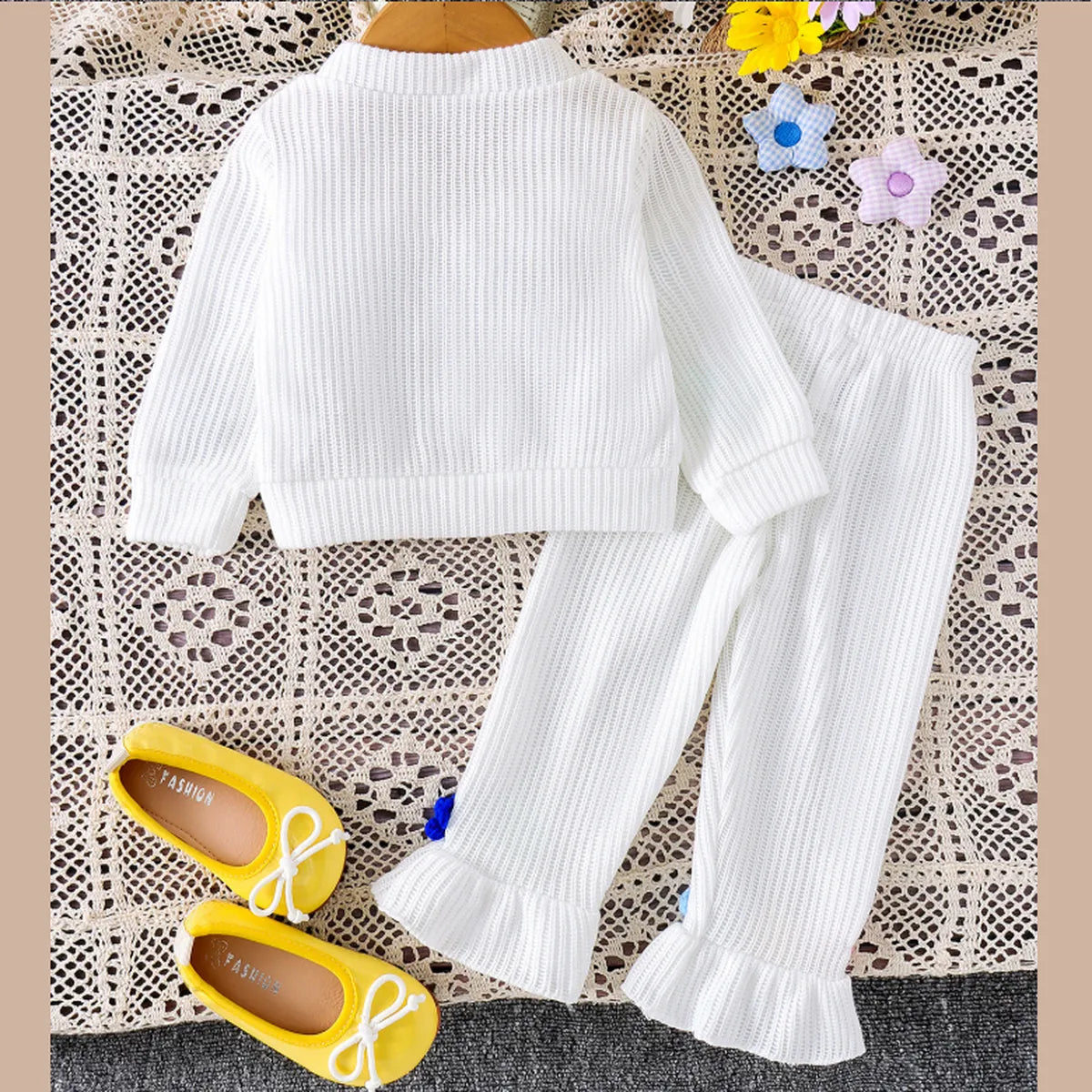 Soft, sweet, and perfect for chilly days 🌸 This 2-piece knit set features a white buttoned cardigan and ruffle-hem pants, both decorated with cheerful, multicolor crochet flowers. A lovely choice for staying warm while looking effortlessly cute.