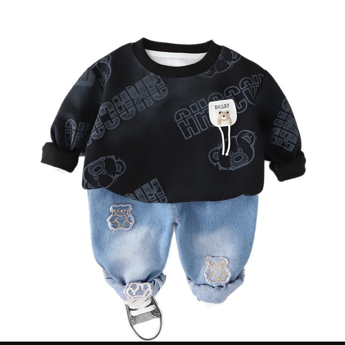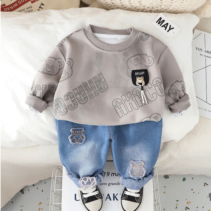 A modern 2-piece set combining a bear-detailed sweatshirt with comfy denim jeans. Available in black, beige, and grey β perfect for stylish everyday wear.