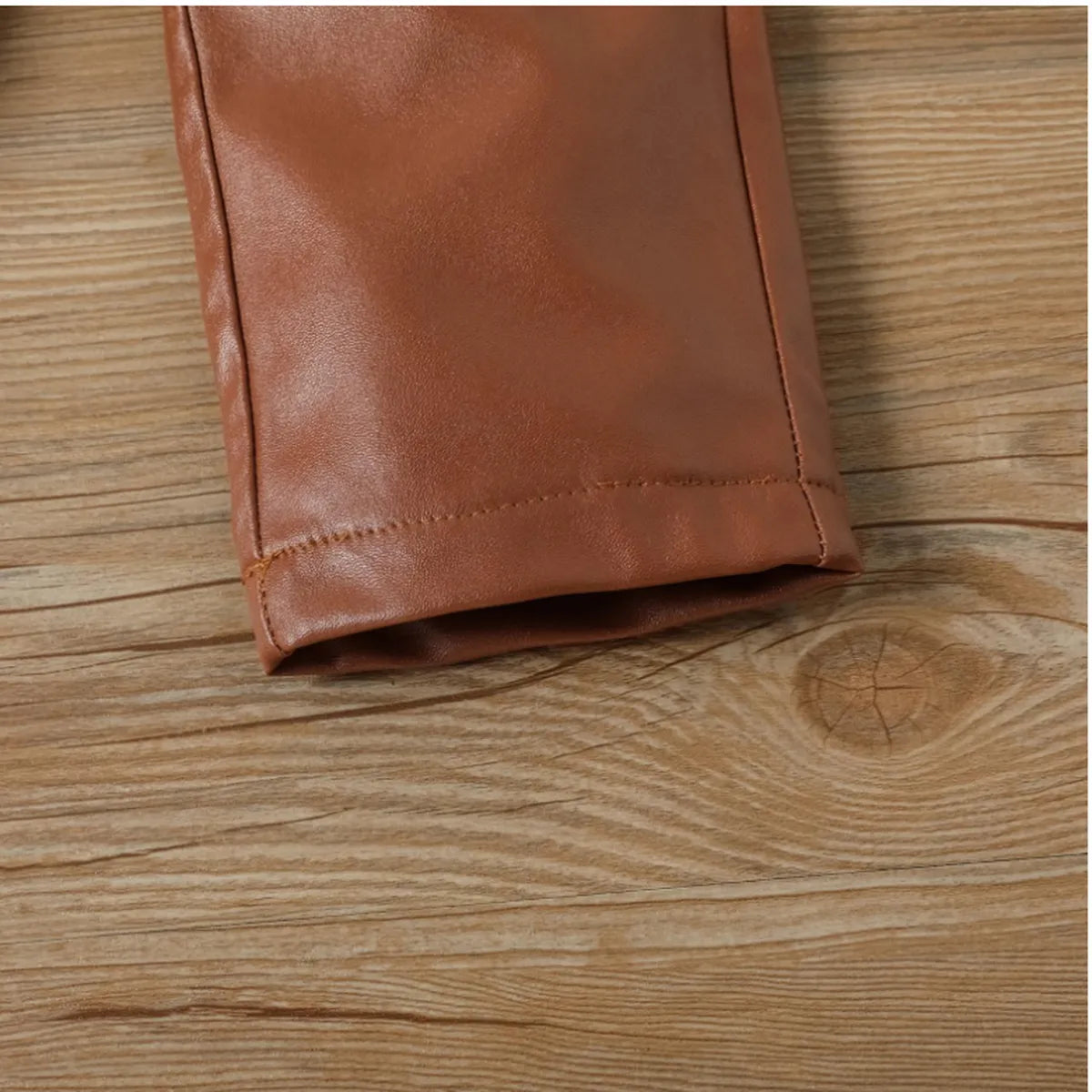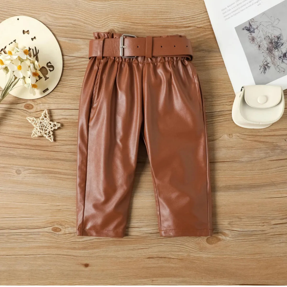 Modern chic with a soft edge. This stylish 2-piece outfit combines a ribbed knit top with dramatic puff sleeves and high-waisted caramel faux leather pants, complete with a matching belt. A sleek choice for fashion-forward little ones.