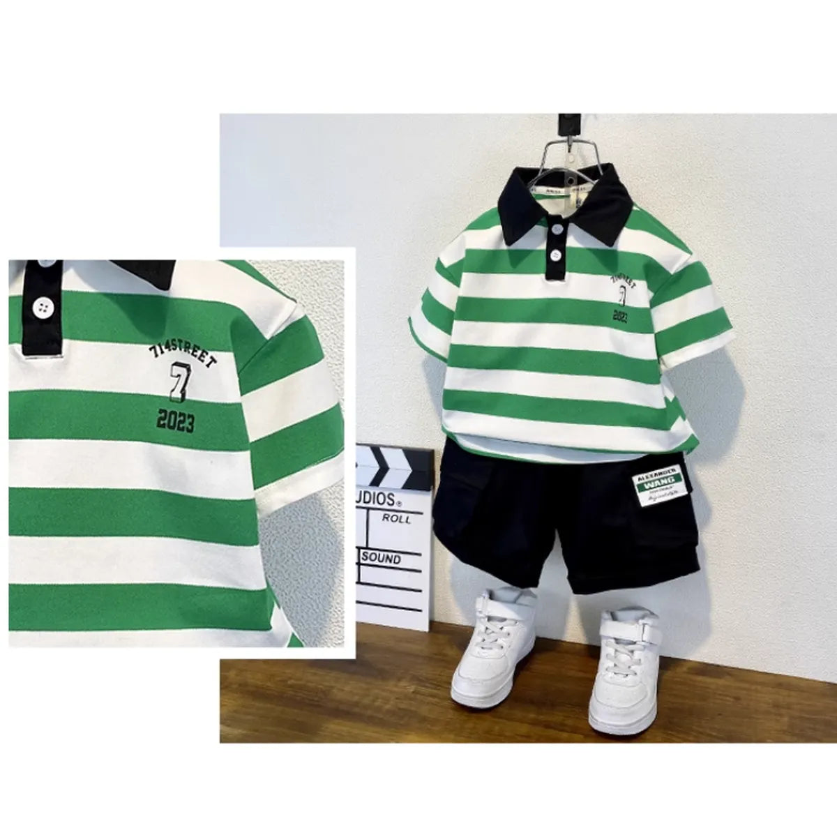 Striped Green Polo & Side-Tag Shorts Set for Boys (1-8 Years)