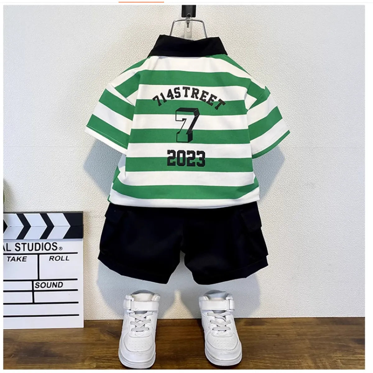 Fresh and playful, this outfit combines a crisp green-striped polo with smart black shorts that feature modern label detailing. Whether itβs a birthday, brunch, or just a good day out β this set brings the charm π.