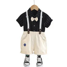 This charming outfit brings timeless elegance with a playful twist. Featuring a black pinstriped shirt with matching bow tie and adjustable suspenders, paired with soft cream shorts β€” it's the kind of outfit that makes memories at birthdays, family photos, or sunny strolls. Easy to wear, easier to love.