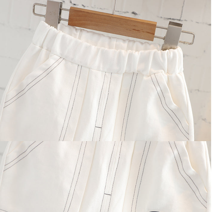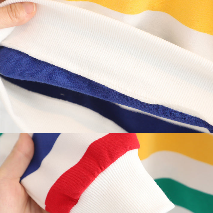 A colorful 2-piece outfit featuring a rainbow stripe top and comfy white pants, completed with a playful dinosaur crossbody bag as a gift. A cheerful choice for fun days out.