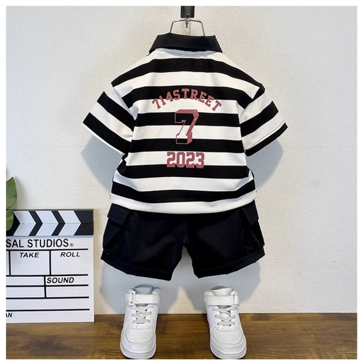 Clean, classic, and made to impress. This striped polo shirt with a varsity-style patch pairs perfectly with solid black shorts featuring side pocket tags. A sporty and polished outfit that works for both casual days and dressed-up moments.