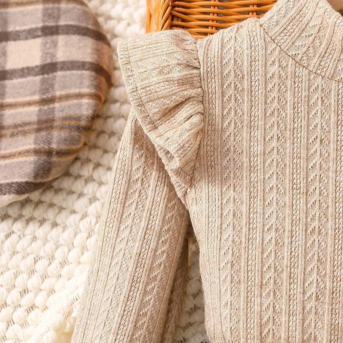 A timeless autumn vibe for your little fashionista π This elegant 4-piece set includes a ruffle-shoulder knit sweater, pleated plaid skirt with belt, matching beret, and a mini crossbody bag. Cozy yet classyβready for fall photoshoots, special outings, or stylish strolls.